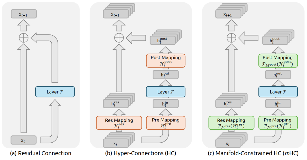 下图对比了标准的ResNet、HC和mHC三种残差连接方式: